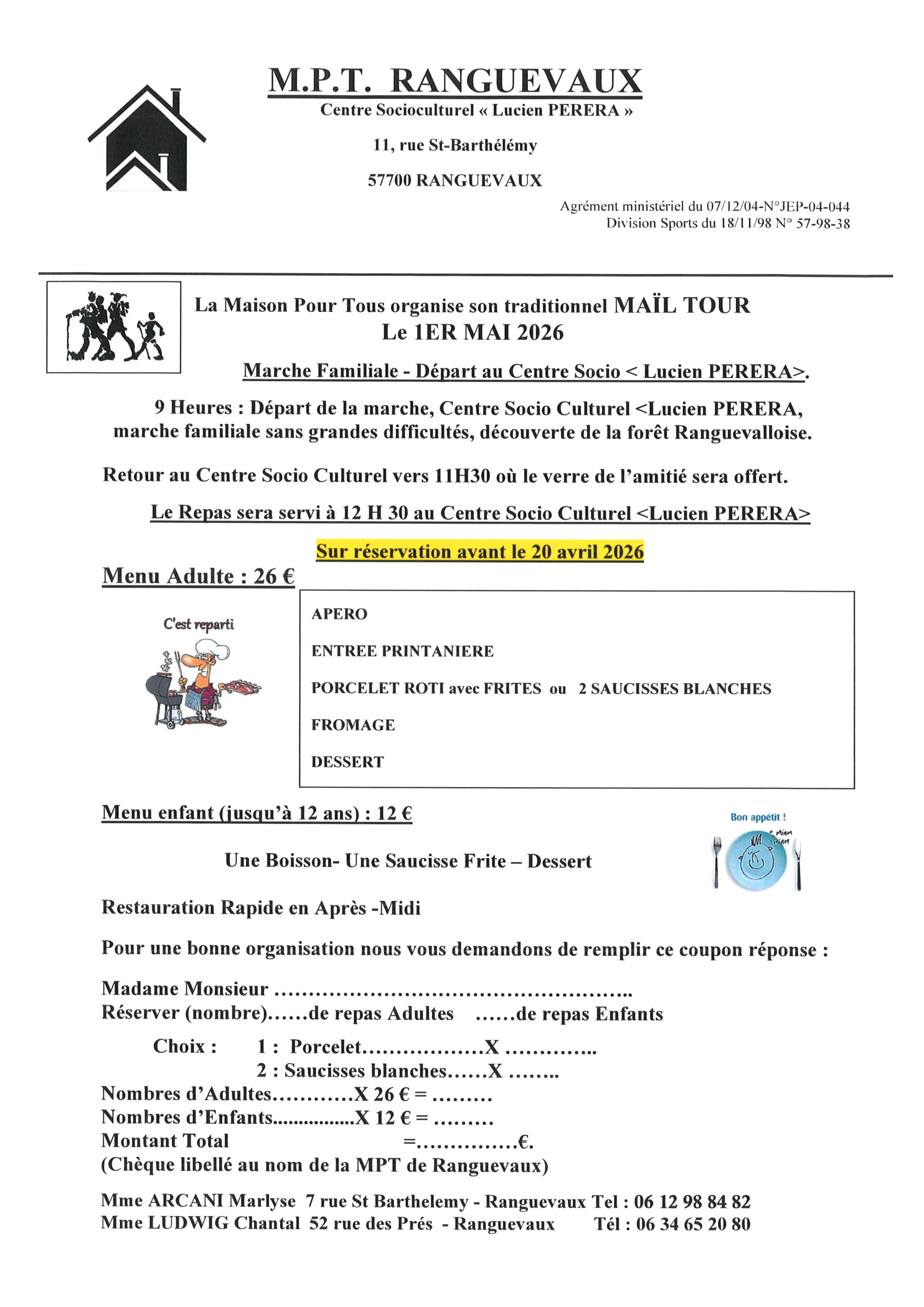 L‘association Maison pour Tous organise son traditionnel mail’tour le vendredi 1er mai. A l’issue de la marche, le verre de l’amitié sera offert à tous au foyer socioculturel. Il sera suivi d’un repas réservé aux inscrits.